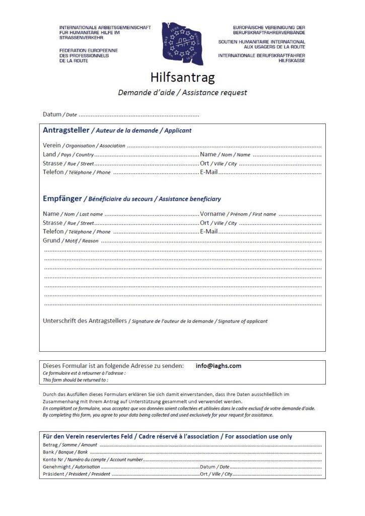 Laden Sie das Hilfeantragsformular herunter oder fordern Sie es bei uns an. Bitte füllen Sie es vollständig aus und fügen Sie alle relevanten Unterlagen (z. B. ärztliche Bescheinigungen, Unfallberichte) bei.